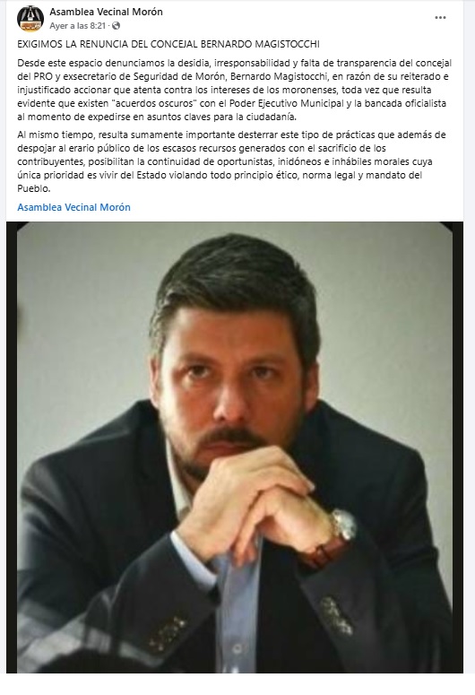 ESTE ES EL PEDIDO DE ASAMBLEA VECINAL MORÓN una asociación de vecinos que estos días en sus redes sociales salió a realizar el pedido de RENUNCIA del concejal y exsecretario de Seguridad del distrito en la gestión de Tagliaferro