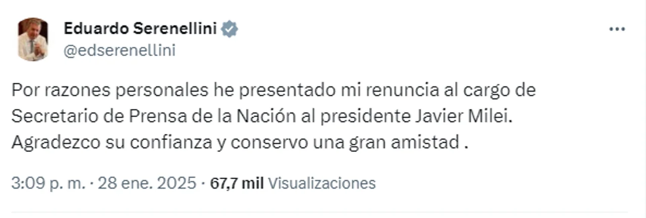 Posteriormente, Serenellini utilizó sus redes sociales para confirmar su dimisión: «Por razones personales he presentado mi renuncia al cargo de Secretario de Prensa de la Nación al presidente Javier Milei».