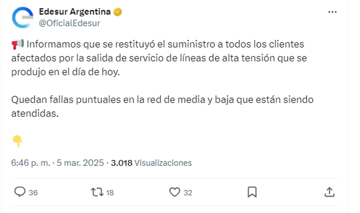 Edesur anunció que se restituyó el servicio tras el masivo apagón, pero persisten fallas en algunas zonas