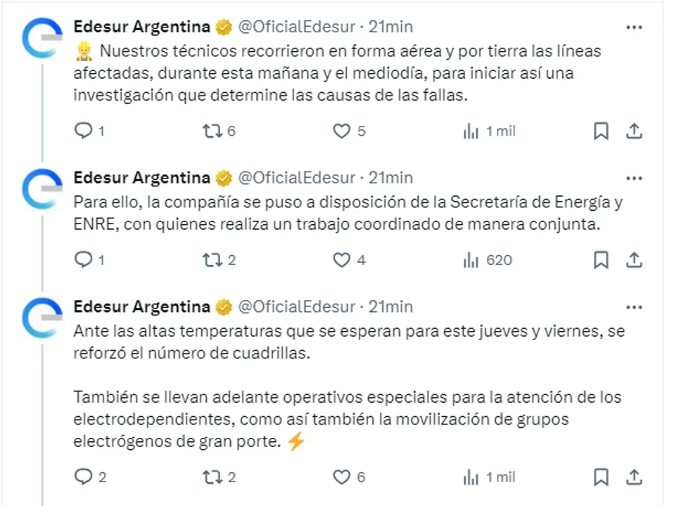 Según detalló la empresa, los especialistas realizaron inspecciones aéreas y terrestres durante la mañana y el mediodía de este miércoles para determinar las causas exactas del colapso en las líneas de alta tensión. Además, Edesur se puso a disposición de la Secretaría de Energía y el Ente Nacional Regulador de la Electricidad (ENRE) para coordinar la investigación sobre el incidente.