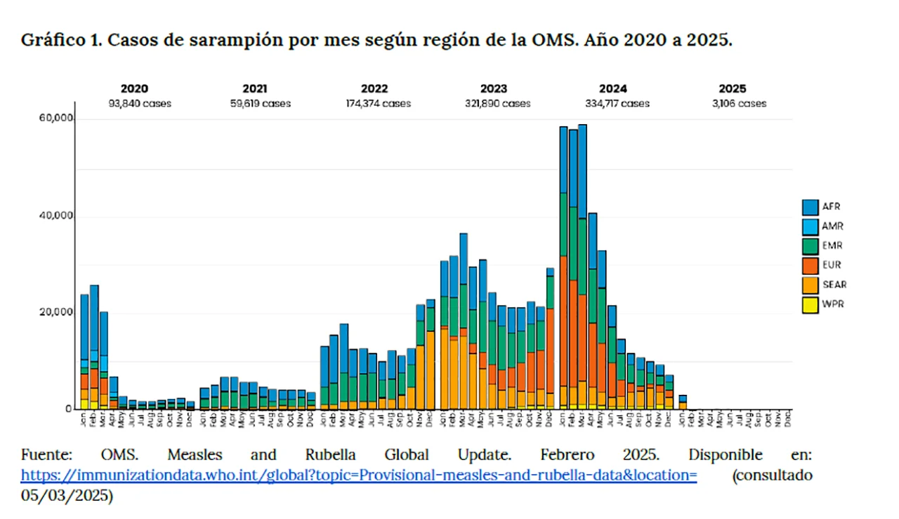 La vacuna sigue siendo la estrategia más efectiva para evitar las consecuencias de la enfermedad El 1 de febrero de 2025 se emitió una primera alerta epidemiológica nacional ante la confirmación de un caso importado de sarampión en una niña proveniente de Rusia, que fue atendida en un hospital de la CABA y el 6 de marzo se emitió un nuevo alerta dando cuenta de la aparición de casos en territorio bonaerense.