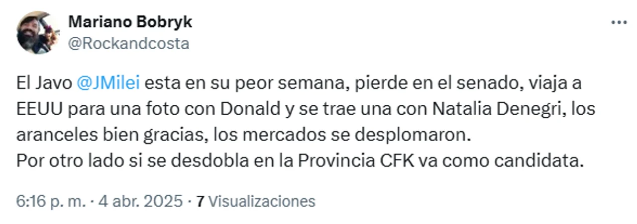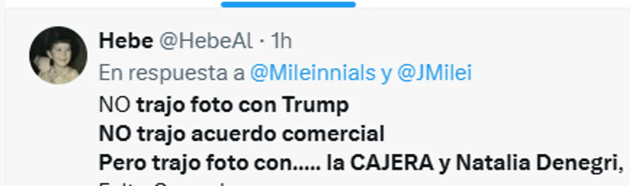 La foto con Denegri, quien también fue galardonada por su labor humanitaria, no tardó en generar repercusión. “NO trajo foto con Trump, NO trajo acuerdo comercial, pero trajo foto con… la CAJERA y Natalia Denegri» ironizó la usuaria @HebeAl en X (ex Twitter). Otros, como @delasBarrerasP, lamentaron los gastos del viaje: “Vacaciones a Miami, avión privado y hoteles 5 estrellas para sacarse una foto con Denegri. Qué vergüenza con la austeridad que vive Argentina”.