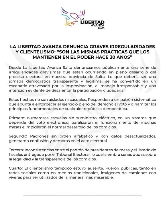 «Denunciamos públicamente una serie de irregularidades gravísimas que están ocurriendo en pleno desarrollo del proceso electoral en nuestra provincia de Salta», fue el inicio del comunicado de LLA.