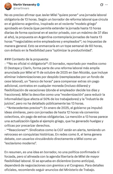 A través de sus redes sociales, Varsavsky explicó que un borrador de reforma laboral que circula en el Gobierno, inspirado en el reciente «modelo griego», contempla la posibilidad de extender la jornada hasta 13 horas, pero siempre de forma «negociable entre empleadores y empleados».