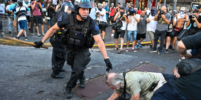 Los manifestantes voltearon las vallas y se enfrentaron a los empujones con los efectivos de la Policía Federal y Gendarmería que estaban dispuestos en el lugar para hacer cumplir el protocolo antipiquetes. Las fuerzas federales utilizaron un camión hidrante para desalentar la protesta.