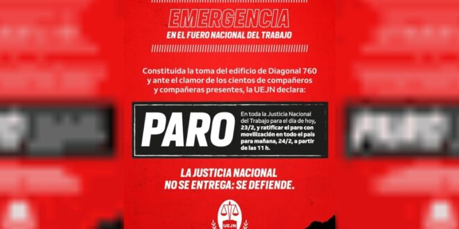 Trabajadores judiciales iniciaron un paro por 48 horas con la ocupación del edificio central de la Justicia Nacional del Trabajo, ubicado en Diagonal Roque Sáenz Peña 760, en la Ciudad de Buenos Aires, en rechazo al traspaso de competencias a la órbita porteña previsto en el proyecto de Reforma Laboral impulsado por el Gobierno.