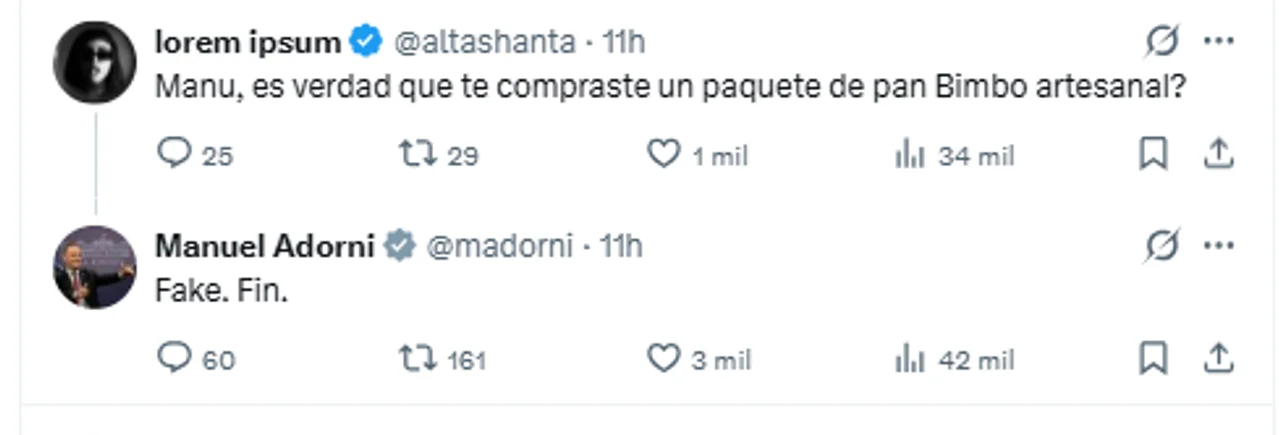Ante las consultas satíricas de distintos usuarios sobre consumos personales y hasta el cambio de luminarias en su domicilio, Adorni respondió con mensajes breves como «Lo hice pero antes de asumir» o «Fake», evitando cualquier referencia a las acusaciones judiciales que pesan sobre su gestión.